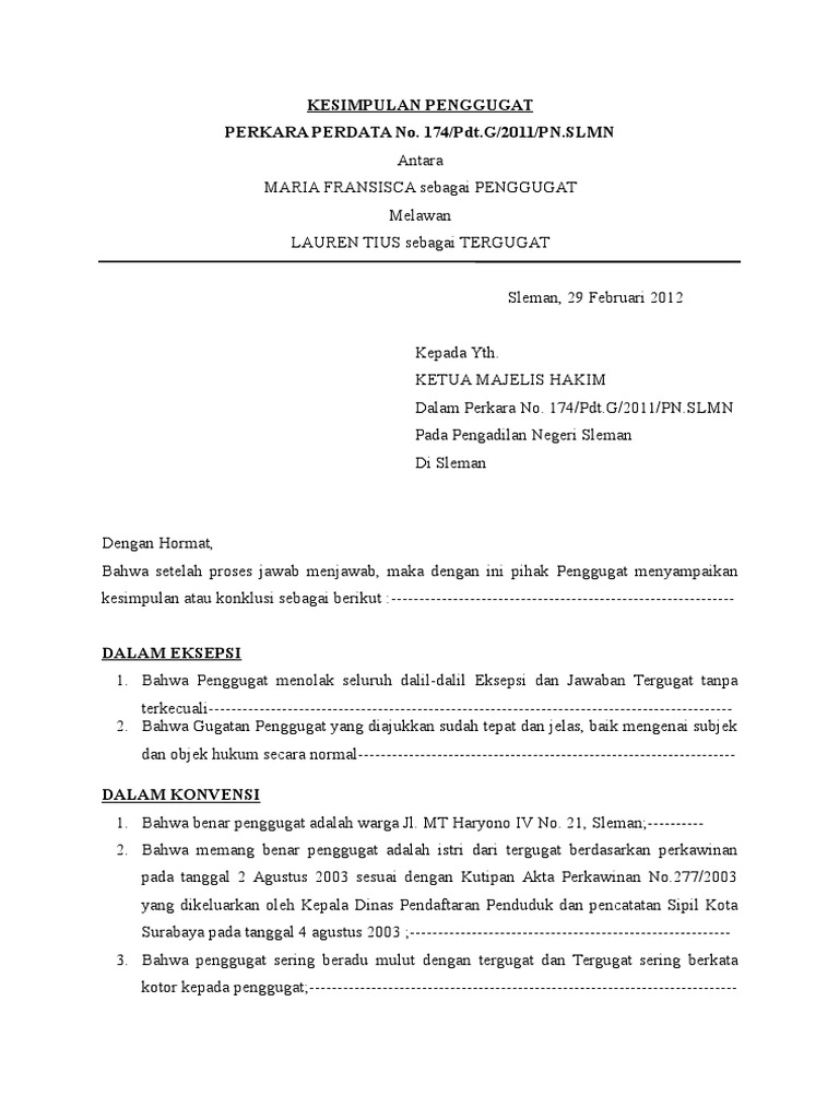 Jawaban Tergugat Eksepsi Dan Rekonvensi Ppt Download from slideplayer.info Eksepsi error in persona adalah eksepsi yang dilakukan oleh tergugat dalam hal penggugat tidak memiliki kapasitas atau hak untuk mengajukan perkara tersebut, atau pihak yang digugat adalah tidak memiliki urusan dengan perkara tersebut, atau pihak yang digugat tidak lengkap. Rap arap 2 months ago. Surat utang dan ancaman perceraian dalam gugatan anak ke ibu. Tergugat menyampaikan keberatan atas gugatan penggungat dengan alasan sebagai berikut demikianlah jawaban tergugat terhadap gugatan penggugat. Eksepsi/jawaban tergugat i dan ii dalam perkara perdata no. Contoh surat gugatan perceraian di pengadilan negeri ~ berikut adalah contoh konsep surat gugatan yang mungkin sangat anda butuhkan, baik nantinya perkara gugatan perceraian tersebut diajukan memakai jasa advokat/pengacara perceraian, atau mengajukan sendiri (inperson). .eksepsi, jawaban tergugat dan gugatan rekovensi dalam perkara perdata register nomor : Identitas pihak penggugat dan tergugat, termasuk pekerjaan dan alamat tempat tinggal harus tercantum jelas dalam surat gugat cerai.